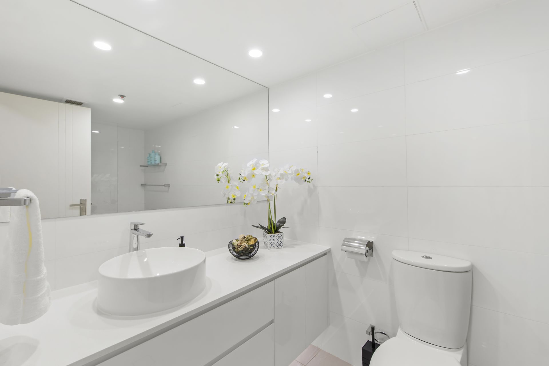 This sky home features spacious open-plan living and dining areas that flow onto a generous full-length balcony. The custom-built kitchen includes Prestige appliances including an integrated dishwasher.