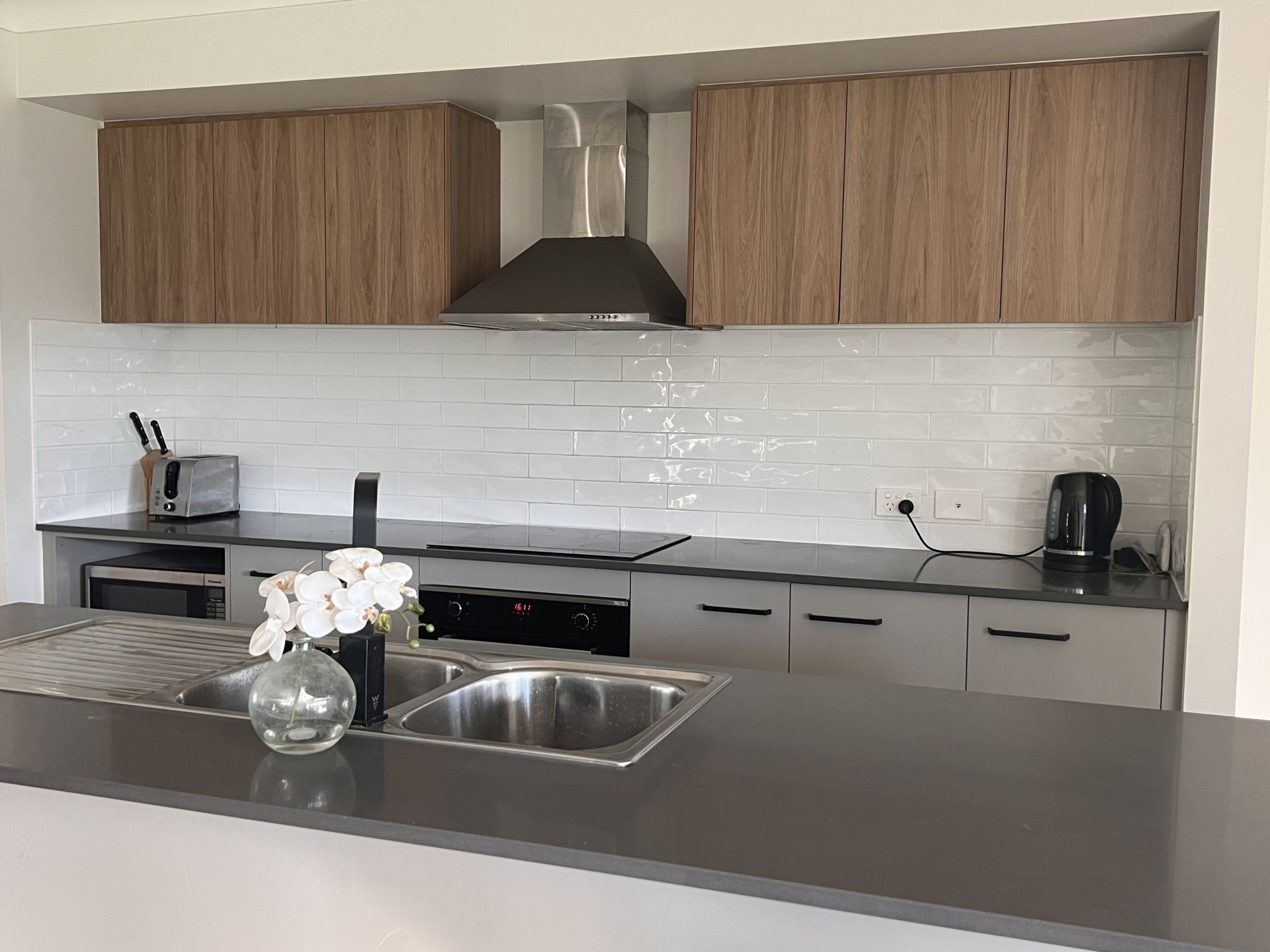 • downlights, and modern drop pendant lighting over island bench